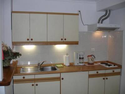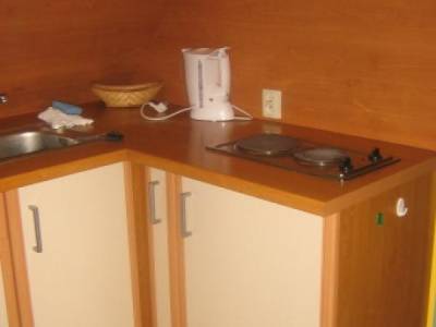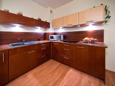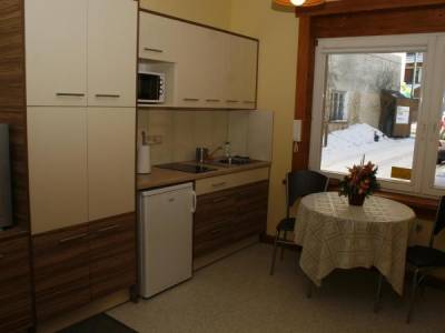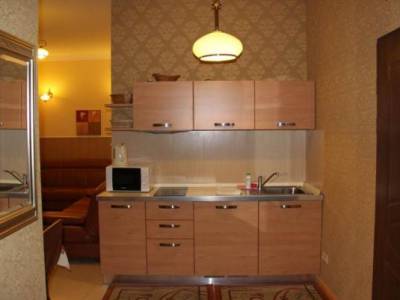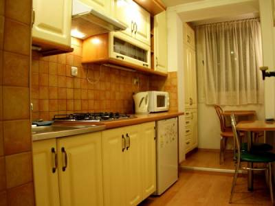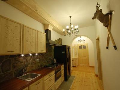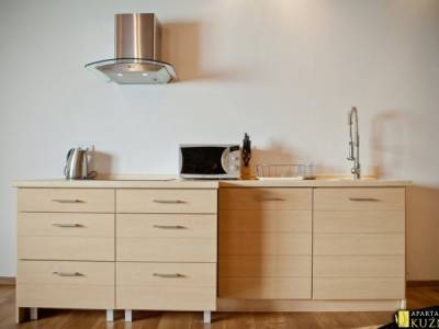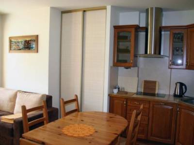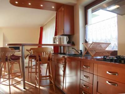 Apartament wyposażony jest w kuchnie z pełnym wyposażeniem (lodówka, kuchenka, kostkarka do lodu,...
