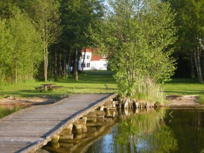 Domek przy wodzie z pomostem. Dwie sypialnie oraz salon z kominkiem. Dostęp do łódki oraz rowerek...