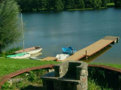 Domek przy wodzie z pomostem. Dwie sypialnie oraz salon z kominkiem. Dostęp do łódki oraz rowerek...