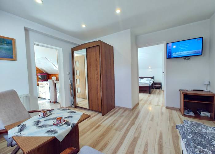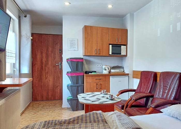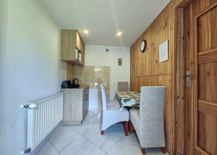- aneks kuchenny /czajnik bezprzewodowy, kuchenka elektryczna jednopalnikowa, kuchenka mikrofalowa, chłodziarka, naczynia, sztućce, garnki, nie ma zlewozmywaka,/naczynia myjemy w łazience gdzie jest przystosowany zlewozmywak/,