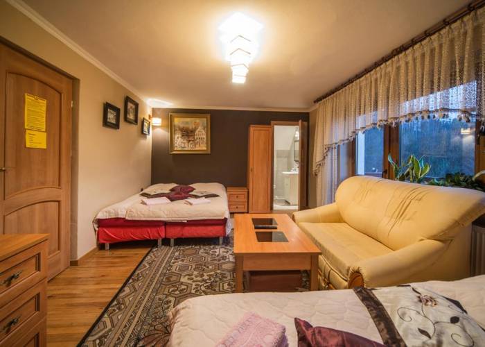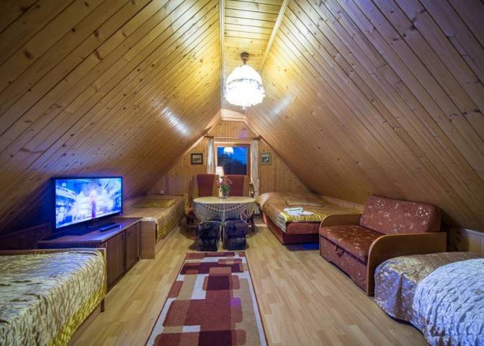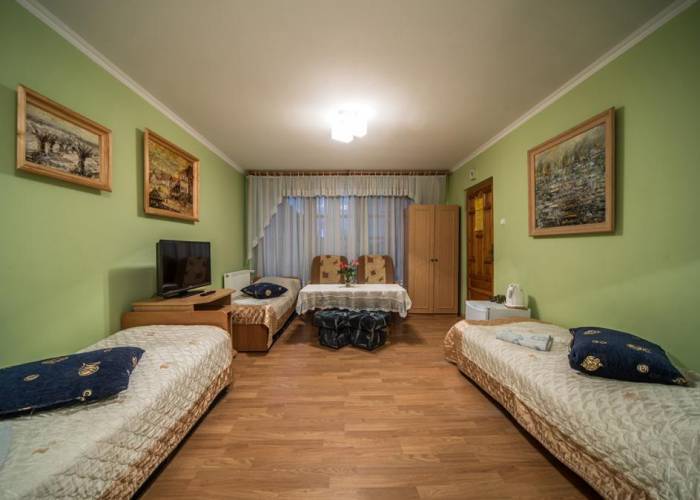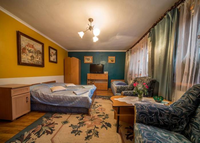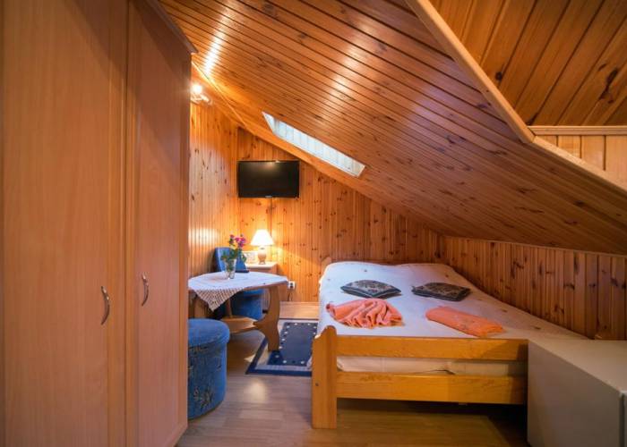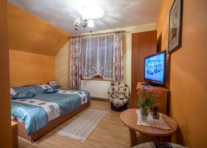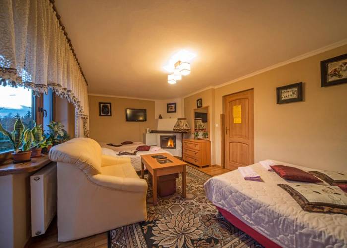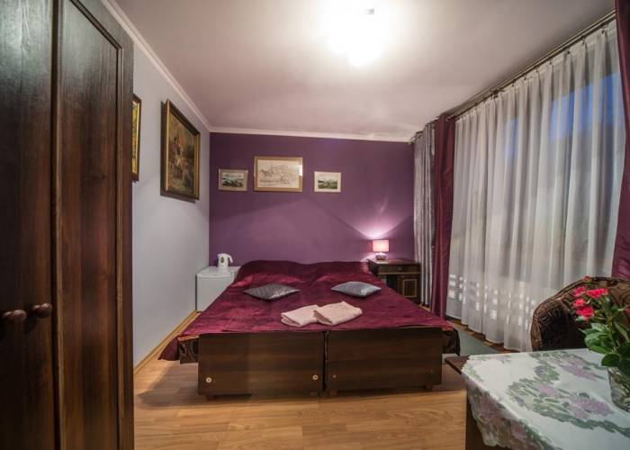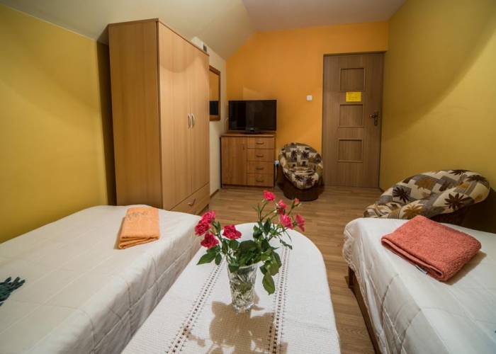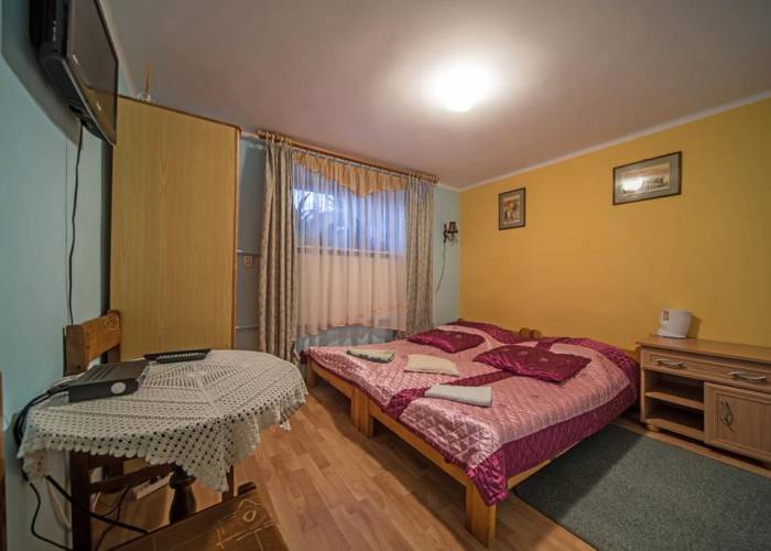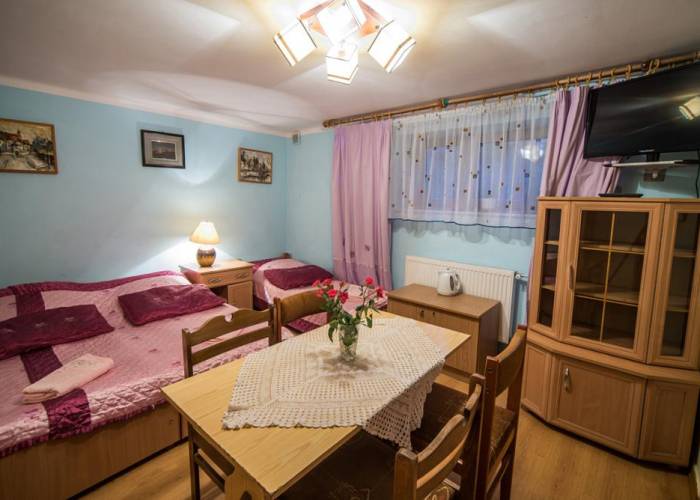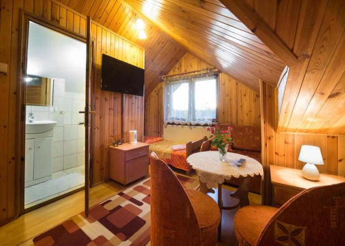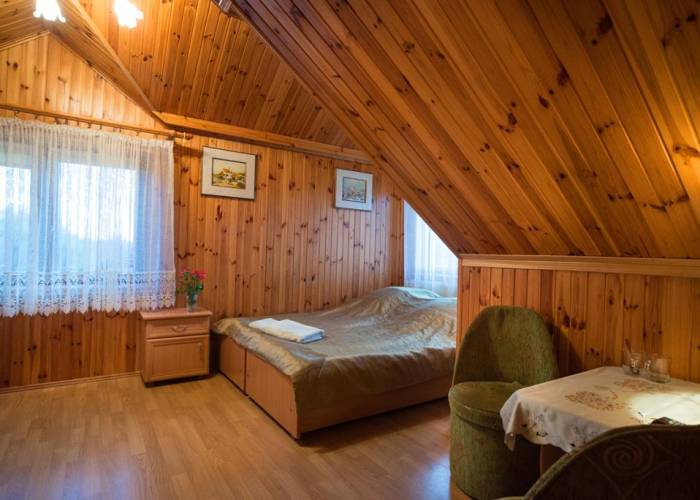 Do dyspozycji Państwa oddajemy pokoje 2, 3 i 4 osobowe z własnymi łazienkami oraz z łazienką w korytarzu (wspólną dla trzech pokoi). Każdy pokój wyposażony jest w telewizor, filiżanki, szklaneczki i ręczniki. Możecie Państwo wybrać pokój z łożem małżeńskim lub z pojedynczymi tapczanami, na poddaszu, piętrze bądź parterze. Posiadamy również pokój z kominkiem i balkonem. Jednorazowo możemy pomieścić 38 osób, a w wersji jedno łóżko jedna osoba - 30 osób.