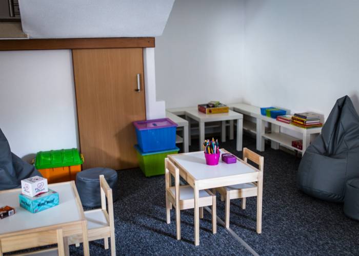 Dla dzieci przygotowaliśmy kącik zabaw z telewizorem z bajkami. Na zewnątrz budynku znajduje się zadaszony mini plac zabaw.