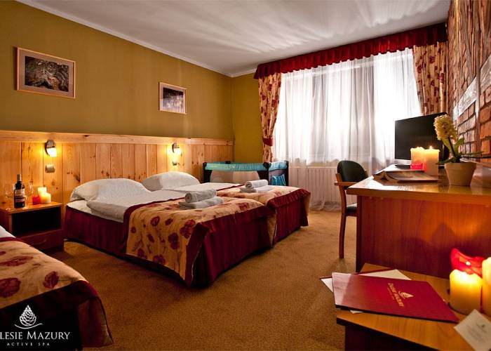 Trzy pokoje "Ocalić od zapomnienia" (około 25m2) - nawiązujące swoim wystrojem do naszego regionalnego Spa. Pokoje posiadają drewniane meble stylizowane na dawne meble, jakie można było spotkać na tych terenach kilka wieków temu. W każdym pokoju znajdą Państwo dwa drewniane łóżka, dodatkowe trzecie łóżko, obszerną komodę, telewizor LCD, krzesła, lodówkę, łazienkę z WC i prysznicem. Wszystkie pokoje hotelowe posiadają oddzielny balkon z krzesłami ogrodowymi.