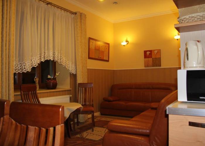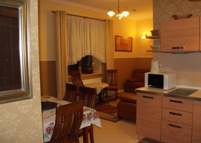 WILLA RADOWID piękny stylowy budynek apartamentowy w centrum Zakopanego. W sąsiedztwie mieści się Grand Hotel Stamary, VillA Marilor. Obiekt jest monitorowany ,ogrodzony z automatyczną bramą .Do każdego apartamentu przynależy miejsce parkingowe .Aby uprzyjemnić Państwa pobyt uruchomiono basen( 6m x 14m ). Wspaniała lokalizacja przy jednokierunkowej ulicy Sienkiewicza gwarantuje ciszę i spokój .a zarazem sprawia że wszystkie atrakcje Zakopanego i okolic są bardzo łatwo dostępne . Tylko 500m dzieli nas do najbardziej znanego deptaku KRUPÓWKI. W odległości ok. 350m znajduje się dworzec PKP i PKS z którego startują busy lokalnej komunikacji.Oddajemy do Państwa dyspozycji nowy funkcjonalny apartament o powierzchni 41 m kw ,składający się z pokoju dziennego z aneksem kuchennym ,sypialni ,łazienki /podgrzewana podłoga/. W apartamencie swobodnie może przebywać 4 dorosłe osoby .Zapewniamy świeżą, czystą pościel ,ręczniki i podstawowe środki czystości. Pokój dzienny - wyposażony jest w wygodne meble ; dwie kanapy z funkcją spania , komodę , telewizor LCD 32 cale , odtwarzacz DVD , stół ,6 krzeseł, szafa . Aneks kuchenny-komplet szafek z zabudowanym sprzętem AGD /płyta grzewcza ,lodówka,pochłaniacz pary/kuchenka mikrofalowa , czajnik elektryczny, toster. naczynia do przygotowania posiłków , komplet talerzy ,sztućce, filiżanki ,kieliszki ,szklanki oraz inne akcesoria kuchenne . Sypialnia - Wygodne dwuosobowe łóżko, dwie szafeczki nocne, lampki nocne , duża szafa ,wieszak, stolik RTV , telewizor 21 cali ,odkurzacz, deska do prasowania ,żelazko .w mieszkaniu internet bezprzewodowy. Gwarantujemy świeżą pościel i ręczniki .