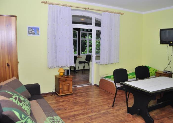 Oferujemy pobyt w pokoju 3-5 osobowym z werandą . Do dyspozycji gości łazienka w pokoju, oraz miejsce do przygotowania posiłków. (Czajnik bezprzewodowy, naczynia, sztućce, lodówka.) TV w pokoju