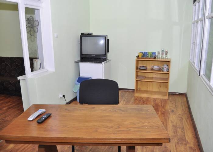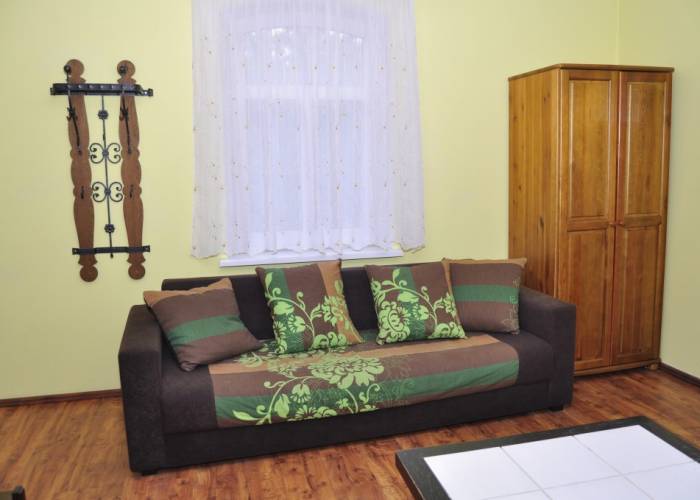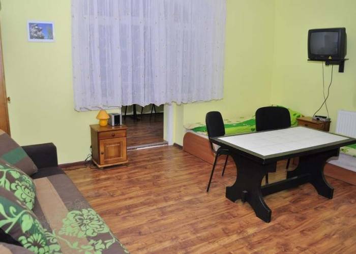 Trzeci pokój 2-4 osobowy z tv (pokój w niższej cenie). Łazienka na korytarzu, lecz do wyłącznej dyspozycji. (Czajnik bezprzewodowy, naczynia, sztućce, lodówka.)