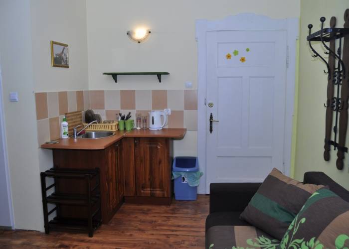 Drugi pokój 3-5 osobowy z TV. Do dyspozycji gości łazienka w pokoju, oraz miejsce do przygotowania posiłków. (Czajnik bezprzewodowy, naczynia, sztućce, lodówka.) Ponadto do dyspozycji (w pokoju) duża weranda.