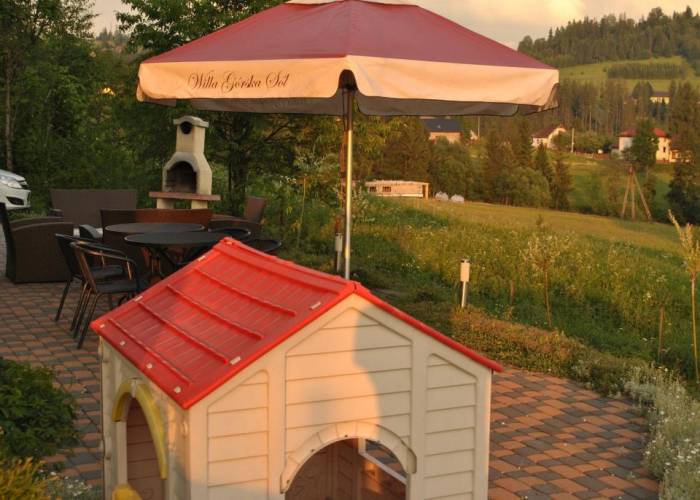 Na tarasie znajdują się grill ogrodowy, meble ogrodowe, parasol przeciwsłoneczny wraz z 4 leżakami.Miejsce zabaw dla dzieci piaskownica ,domek zabaw,Zamek do zabaw Teren, na którym znajduje się obiekt wakacyjny jest