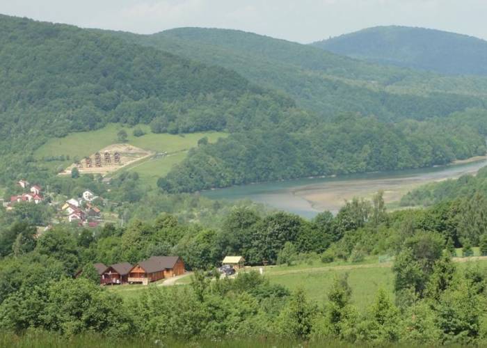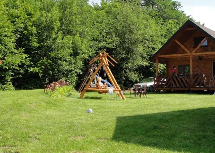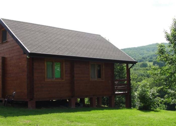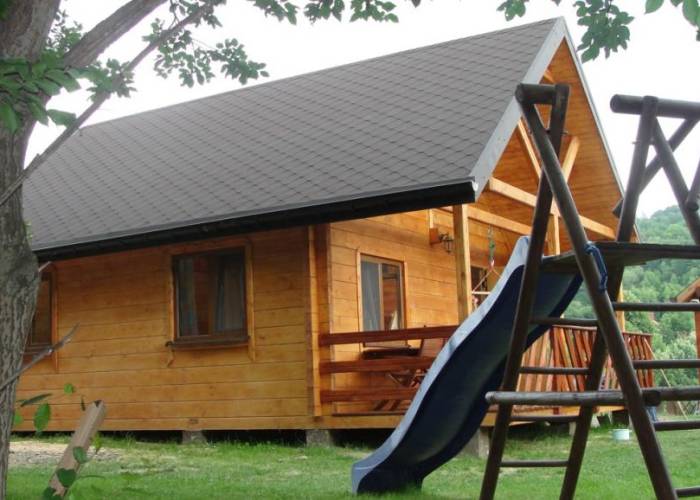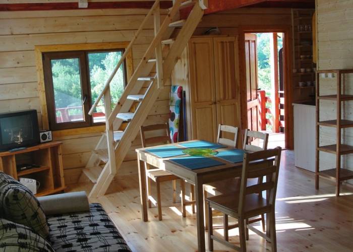 Duże drewniane domki z tarasem i antresolą. W każdym domku jest do 8 miejsc noclegowych dla dorosłych osób. W domku jest aneks kuchenny, salono-jadalnia ,łazienka z prysznicem, dwie oddzielne sypialnie oraz antresola z widokiem na salon z dwoma miejscami do spania. Pełne wyposażenie. Domki położone są na wzgórzu, od północy i zachodu graniczą z lasem a z tarasu widok na południe na zieloną ścianę sąsiedniego wzgórza i lesistą dolinkę.
