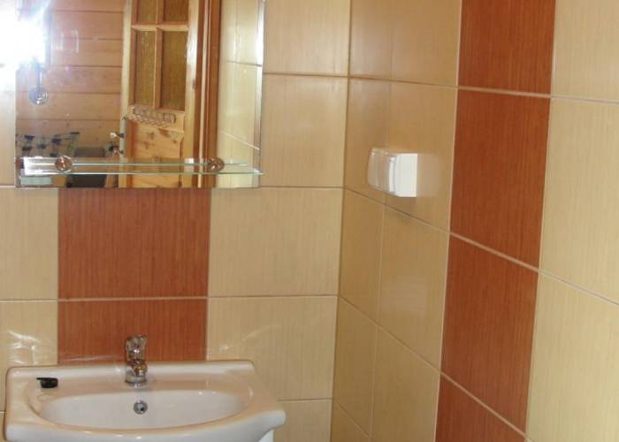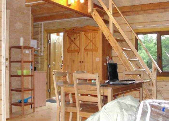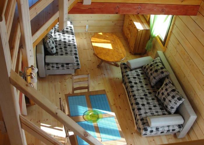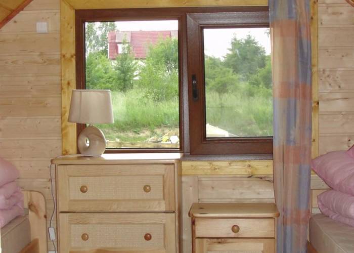 Duże 8-osobowe drewniane domki z bali. W każdym domku jest możliwość noclegu 8 osób. Sześć osób w oddzielnych dwuosobowych sypialniach i dwie w saloniku.