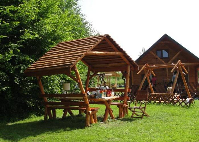 Na terenie znajduje się duża altana, huśtawki i zacieniony stół biesiadny.