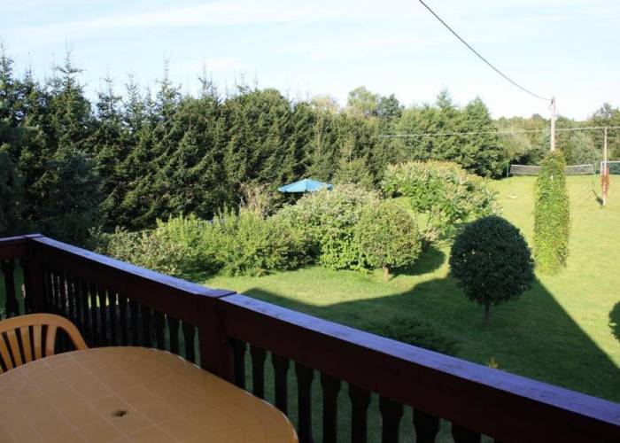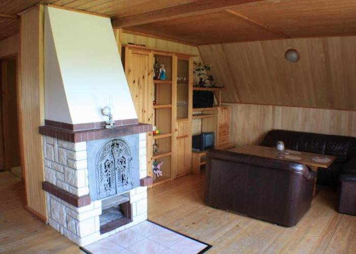 Domek duży - piętrowy, składa się z dwóch niezależnych segmentów, każdy po 80 m2. Posiada 2 i 3 osobowe sypialnie dla 9 osób + łóżeczko dla dziecka, dwa salony wypoczynkowe z kominkami w tym jeden z bilardem, aneks kuchenny na piętrze i kuchnię na parterze. Na każdej kondygnacji łazienki w tym jedna z pralką. Na zewnątrz umeblowane tarasy.