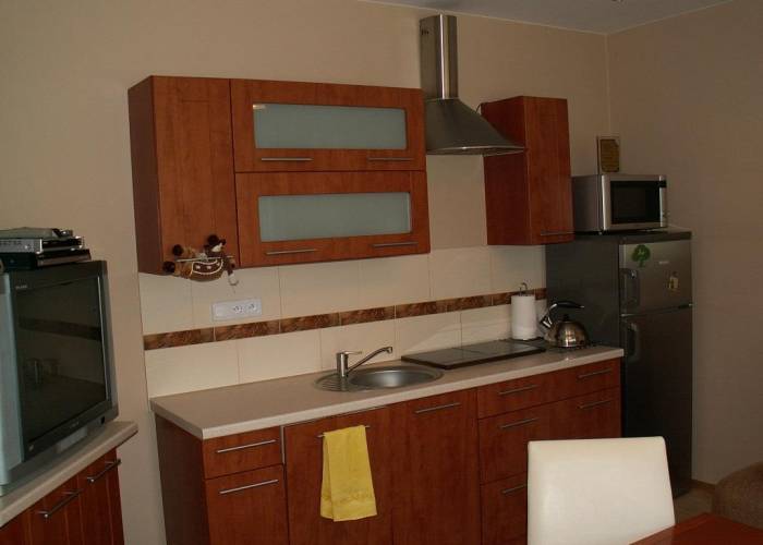 Wejście do apartamentu jest również niezależne, a do dyspozycji Gości TV-SAT i internet bezprzewodowy. Kuchnia wyposażona jest w lodówkę, kuchenkę gazową, kuchenkę mikrofalową, czajnik bezprzewodowy, komplet naczyń, talerzy, szkła i sztućców.