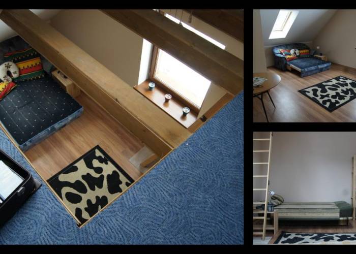 Otwarty parter to miejsce na wspólne posiłki i długie wieczorne rozmowy przy kominku. Trzy pokoje i dwie antresole na piętrze dają możliwość swobodnego i wygodnego rozlokowania się nawet dla 12 osób.