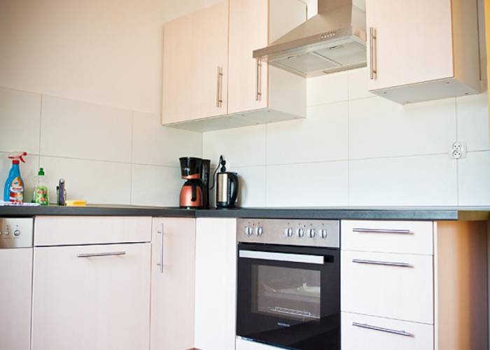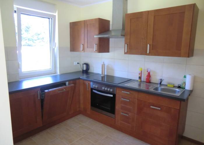 - kuchni w pełni wyposażonej w lodówkę z zamrażarką, kuchenkę elektryczną z płytą ceramiczną i piekarnikiem, zmywarkę, czajnik elektryczny, ekspres do kawy, zestaw naczyń i sztućców dla 4 osób.