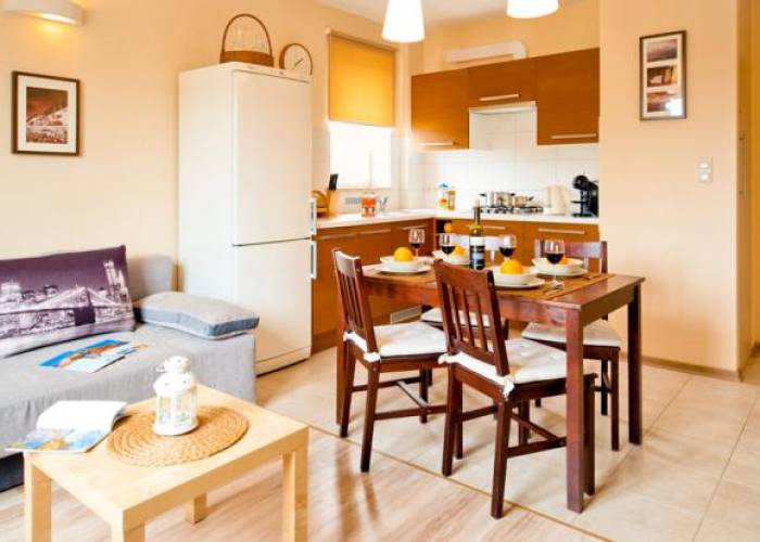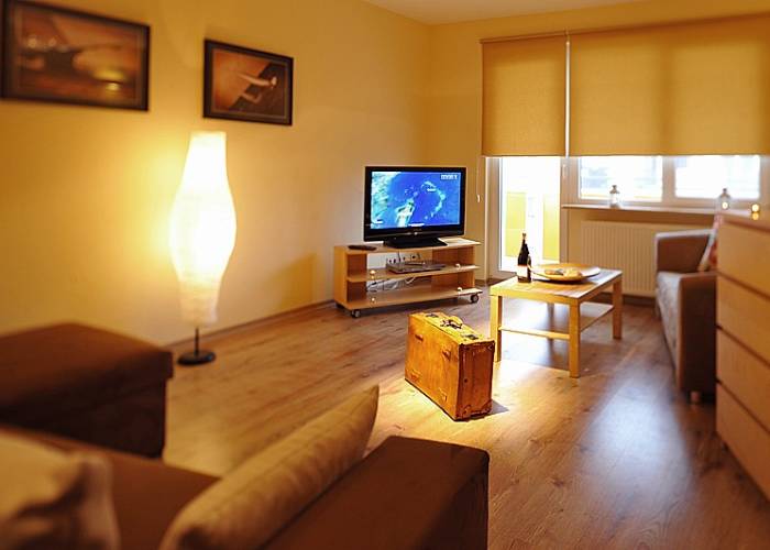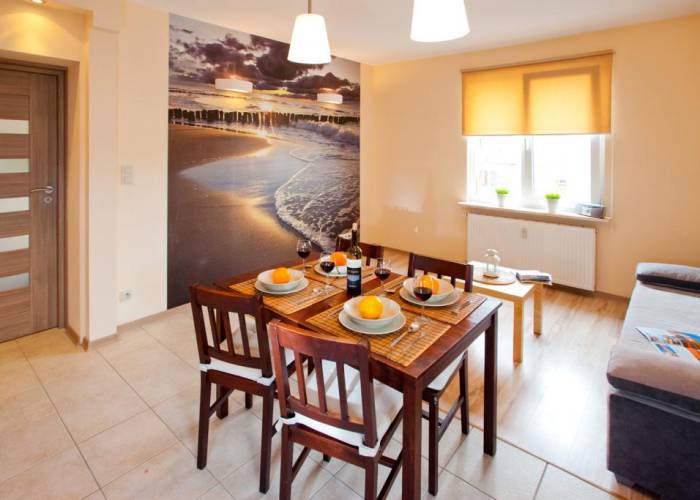 Przeznaczone dla 1, 2, 3, 4, max.5- 6 osób. Wyposażone w tv plazmowy 37 cali, dvd z czytnikiem usb, kart SD (obsługiwane formaty mp3, mp4, divx, itp.), ekspres do kawy,lodówkę, kuchenkę, czajnik bezprzewodowy, pralkę, żelazko, suszarkę do włosów, suszarkę na bieliznę, serwis plażowy ( 2 parawany, 2 leżaki aluminiowe ), naczynia kuchenne, zastawę stołową oraz sztućce, korkociąg, szklanki do napojów, pokale do piwa, kieliszki do wina i wódki, talerze deserowe, obiadowe, filiżanki do kawy, kubki, patelnia, itp. co pozwala we własnym zakresie komponować posiłki. W salonie znajdują się dwie kanapy dwuosobowe: duży rozkładany narożnik, oraz rozkładana sofa. W 2 pokoju z aneksem kanapa 2 osobowa typu finka z widokiem na morze - fototapeta. Mieszkanie pachnie świeżością, utrzymane w ciepłej śródziemnomorskiej kolorystyce, zapewni Państwu miły, niezapomniany wypoczynek w nadmorskim kurorcie.