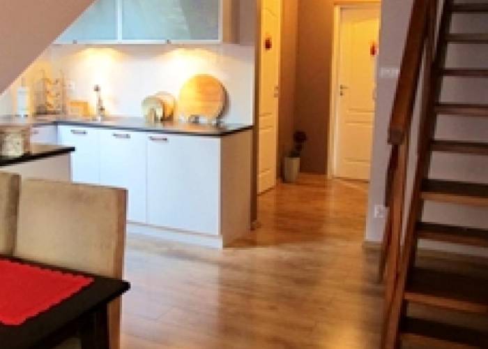 Dwupoziomowe mieszkanie posiadające aneks kuchenny, łazienkę, sypialnię, 2 balkony, poddasze na którym umieszczono sypialnię i kącik telewizyjny