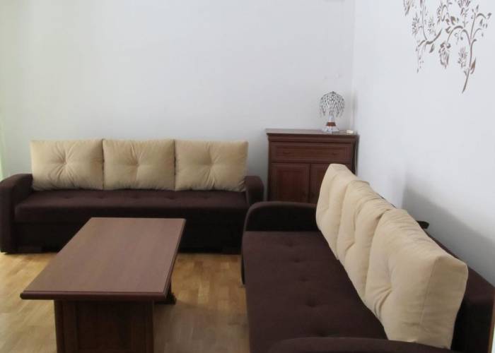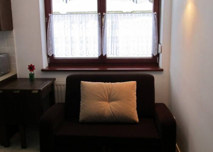 1 sofa (rozkładana dla 2 osób), szafa, komoda, wyjście na balkon