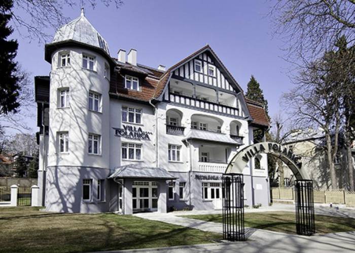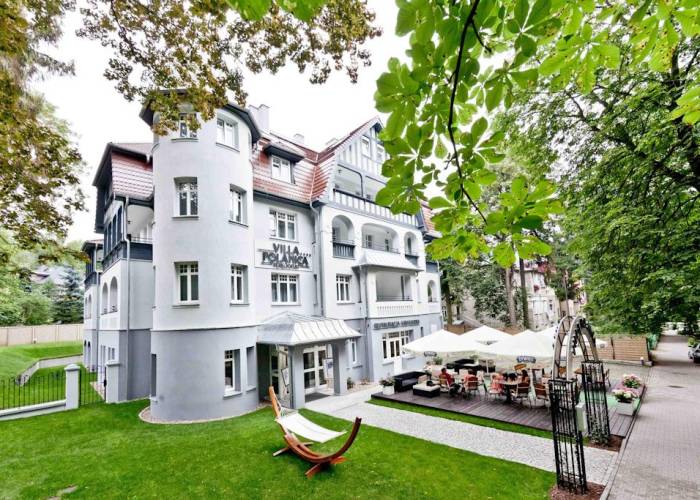 Zdobywamy uznanie dzięki nowoczesności, imponującej rekonstrukcji zabytkowej willi, świetnej lokalizacji, oraz szlachetnemu urokowi najlepszych tradycji, znanego w całej Europie kurortu. Naszą dumą jest połączenie ponadstandarowych, tradycyjnych wartości i dobrze pojętej nowoczesności. Z jednej strony, na ścianach VILLA POLANICA**** znajdą Państwo kolekcje fotografii Tomasza Sikory, malarstwa Jacka Caputy, galerię plakatów teatralnych, muzycznych oraz okazjonalnych, w tym przedwojennego Norblina. Z drugiej zaś, wygodę naszych Gości zapewni szerokopasmowy Internet, telewizory LED z cyfrową telewizją satelitarną i luksusowe wyposażenie każdego pokoju. Do okien zaglądają wiekowe drzewa Parku Zdrojowego, ale już krótki spacer pozwala poznać jego współczesne, rewitalizowane z pietyzmem oblicze: tańczące kolorowe fontanny, punkty widokowe i przeszkloną kaskadę.