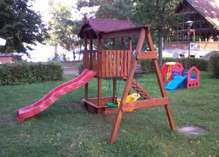 Ośrodek posiada domki campingowe, pawilon noclegowy, pole namiotowe i caravaningowe, restaurację-pizzerię z barem, sale do zajęć dydaktycznych, miejsce na ognisko, miejsce przeznaczone do kąpieli z plażą trawiastą oraz przystań dla statków Żeglugi Mazurskiej i wypożyczalnię sprzętu wodnego. Kooperuje min. z organizatorami spływów kajakowych i prywatną żeglugą pasażerską.