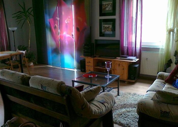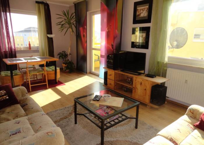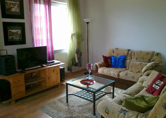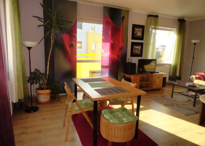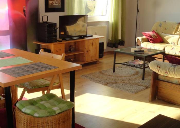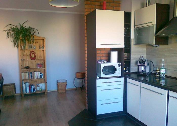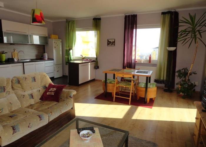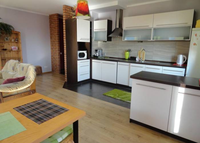 Dwupoziomowy, przyjaźnie zaaranżowany apartament przy ul. Anny Jagiellonki 34, przygotowany na pobyt 5 osób. Na dole duży salon z aneksem kuchennym i wyjściem na balkon, na półpiętrze 2 sypialnie i łazienka. W jednej sypialni znajduje się szerokie, dwuosobowe łóżko, natomiast w drugiej 2 łóżka jednoosobowe: tapczan i rozkładany fotel. W salonie znajdują się 2 sofy wypoczynkowe - jedna z funkcją spania.
