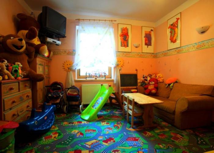 Pokoju zabaw dla dzieci wyposażonego w TV, komputer, zabawki, pluszaki, gry planszowe, książki,
