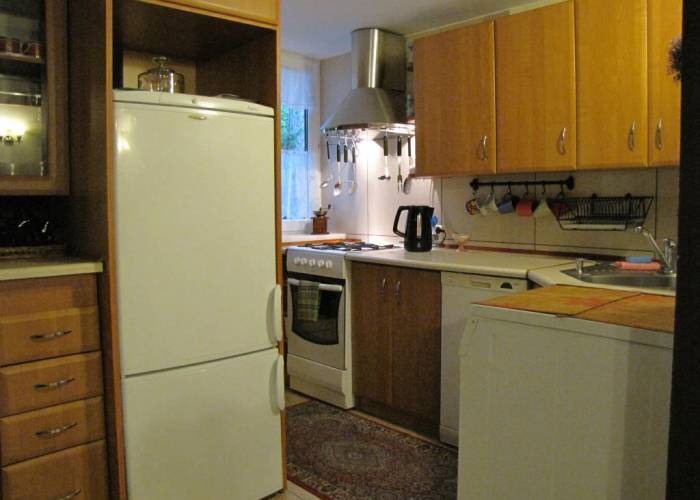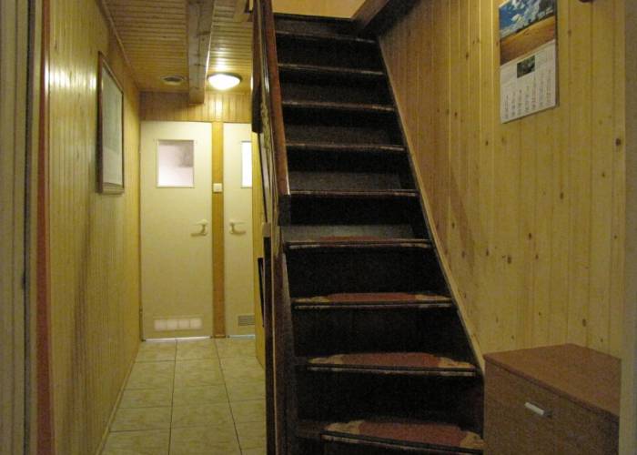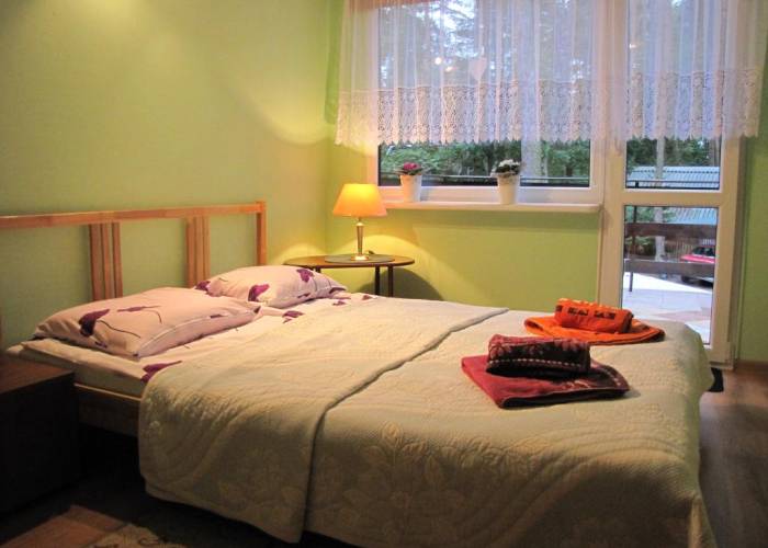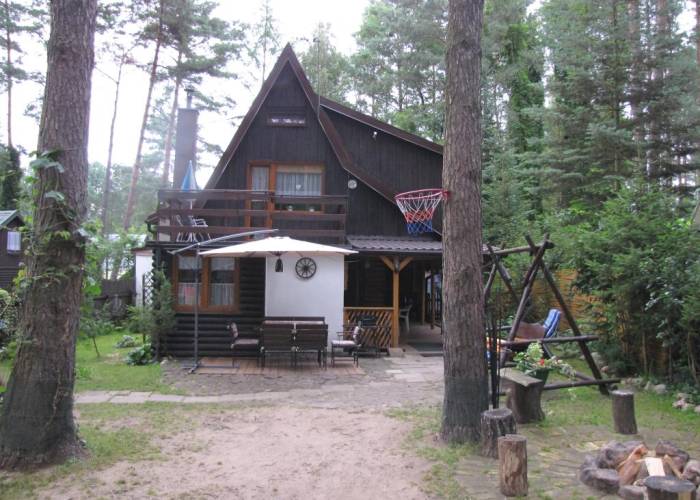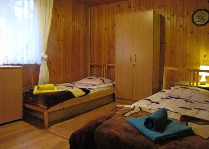 Na parterze znajduje się salon z kominkiem ,TV, Internet (wi-fi), kuchnia z pełnym wyposażeniem, zmywarka, pralka, wyjście na zadaszony taras oraz łazienka z natryskiem, wc. W salonie mogą spać 2 osoby na rozkładanej kanapie narożnej. Na piętrze jest sypialnia - 2 osobowa ( podwójne łóżko), z tego pokoju można wyjść na niezadaszony taras, sypialnia 4 - osobowa (dwa pojedyncze łóżka oraz wersalka ). Poddasze to sypialnia 3- osobowa ( pojedyncze łóżka). W domku jest rozprowadzone ogrzewanie kominkowe. Samochód można zaparkować na zamkniętej, ogrodzonej posesji domku.