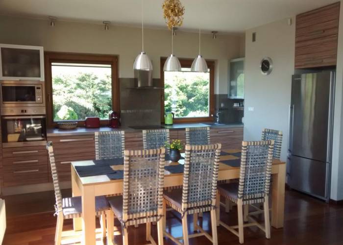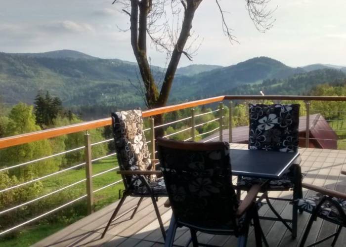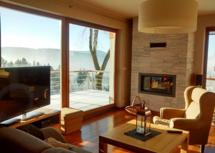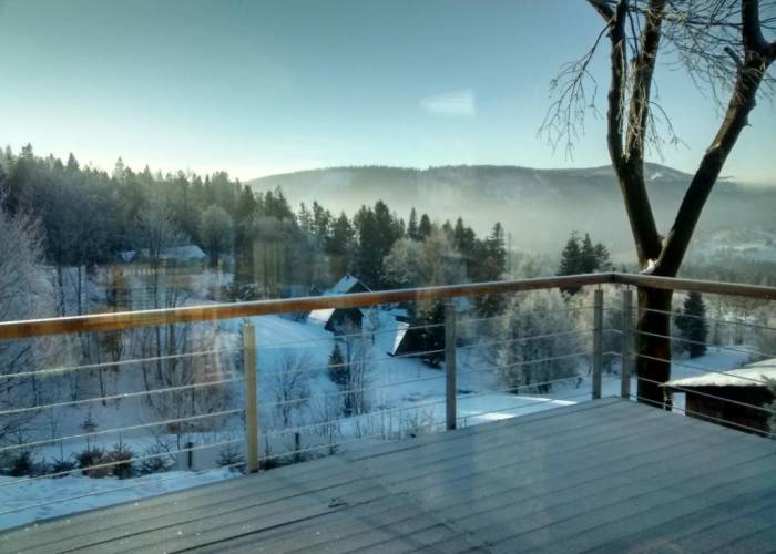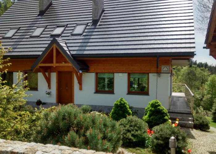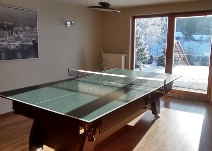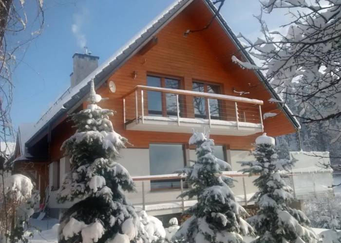 Komfortowy dom dla 8 osób położony 100 m od górnej stacji wyciągu krzesełkowego Mały Rachowiec, 400 m od wyciągu Duży Rachowiec, 400 m od karczmy Swojskie Klimaty. Duży salon TV z kominkiem i tarasem z widokiem na okoliczne góry, jadalnia, w pełni wyposażona kuchnia. Bilard, stół ping-pongowy, sauna infrared, narciarnia. 3 sypialnie 16m2 z łazienkami, mały pokoik 1-os bez łazienki. Strome podjazdy drogą asfaltową, zimą konieczne łańcuchy.