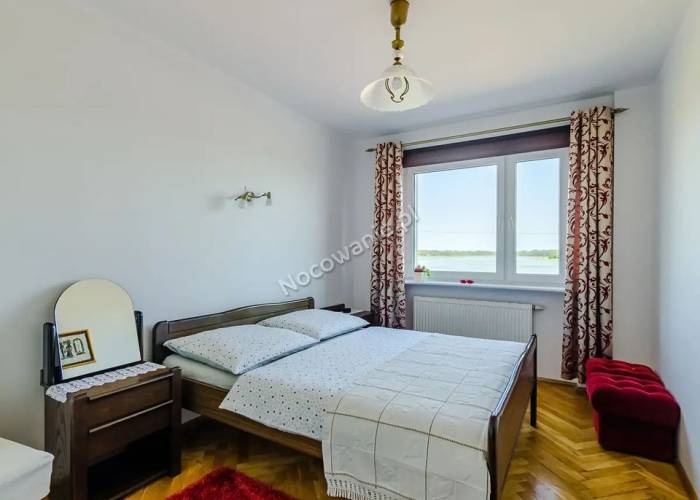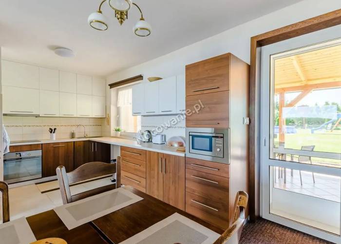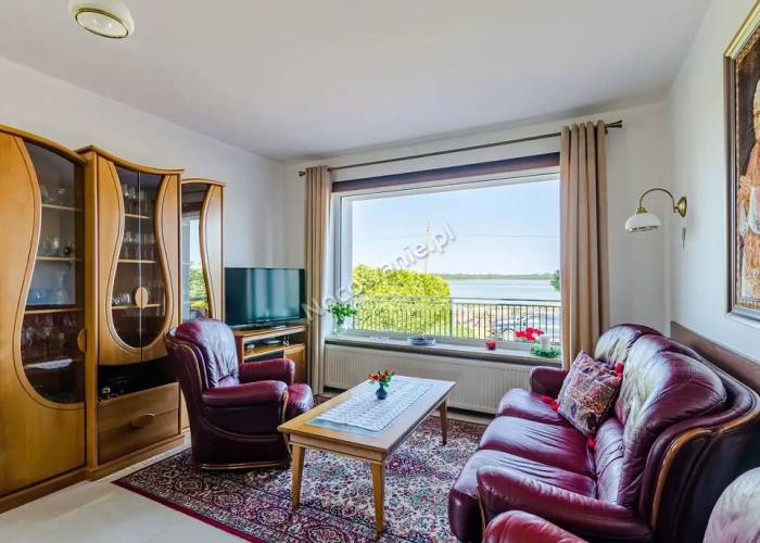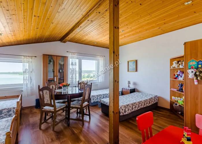 Do dyspozycji gości oddaję duży salon połączony z kuchnią, wyposażony w telewizor (42 cale), internet, radio, zestaw wypoczynkowy, witrynę z naczyniami użytkowymi, duży stół z krzesłami. Z salonu z panoramicznym oknem na jezioro jest wyjście na zadaszony taras i duży ogród. Na poziomie salonu z kuchnią jest korytarz, przedpokój, WC i spiżarnia. Półpiętro zajmuje łazienka z prysznicem i trzy sypialnie (jedna sypialnia z łóżkiem dwuosobowym, dwie sypialnie z łóżkiem dwuosobowym i tapczanikiem dla dziecka)