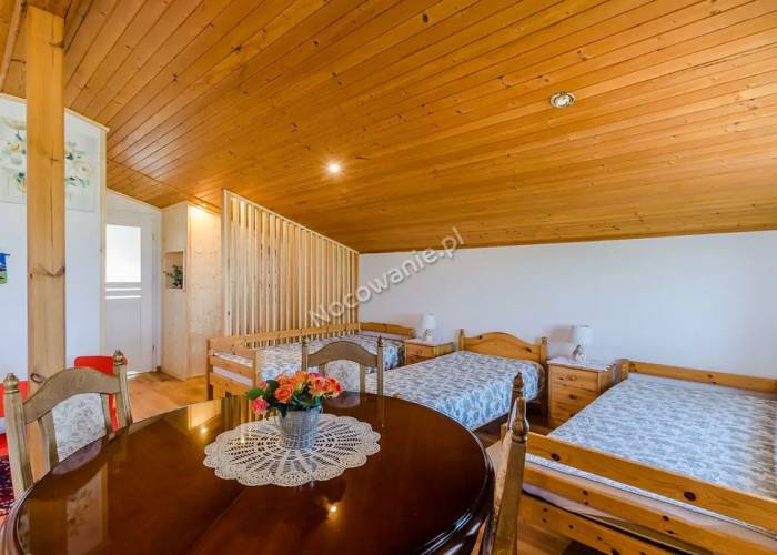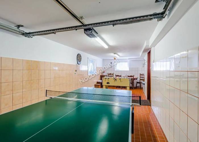 Na piętrze jest pokój dla dzieci z pięcioma łóżkami jednoosobowymi (pełnowymiarowe) wyposażony w biurko, szafę, mebelki dla maluszków, zabawki, gry planszowe, przybory do kolorowania i malowania. Piętro zajmuje łazienka z prysznicem, pokój telewizyjny i dodatkowa sypialnia z łóżkiem dwuosobowym i tapczanikiem dla dziecka, na życzenie może być wstawione łóżeczko turystyczne. W wysokiej piwnicy jest druga kuchnia w pełni wyposażona z pralką ogólnodostępną. Garaż zajmuje stół z piłkarzykami, stół do tenisa, dart.