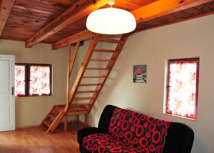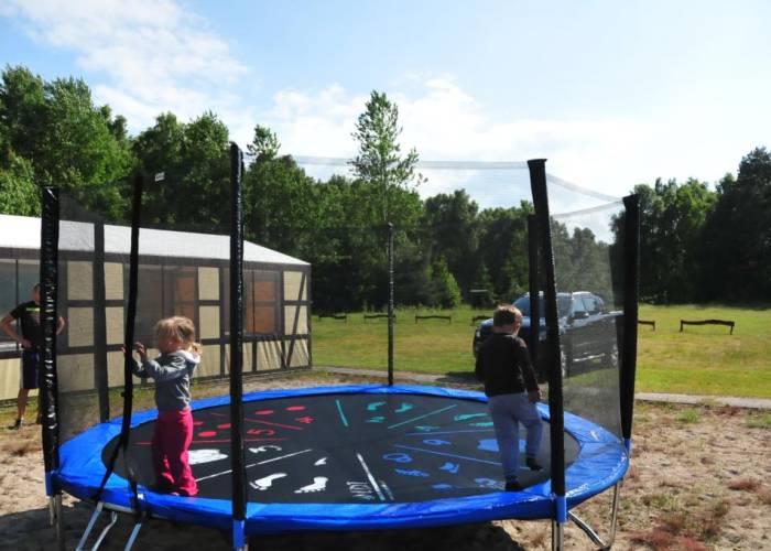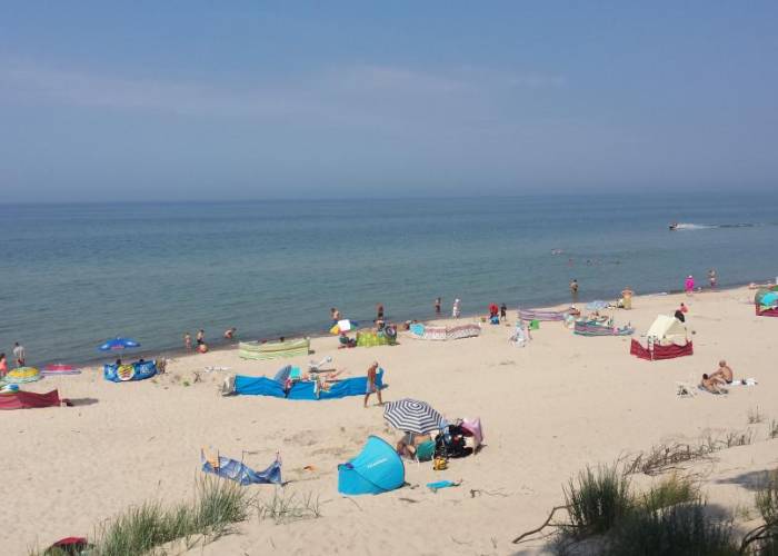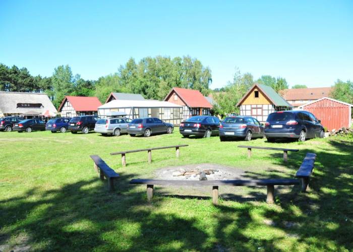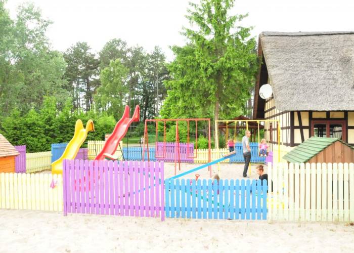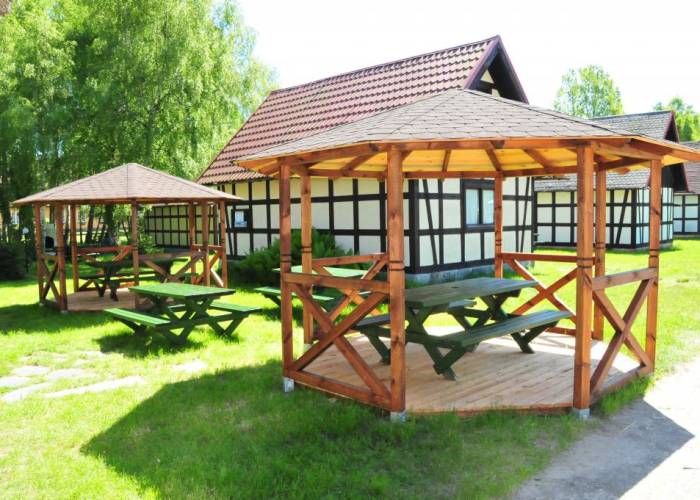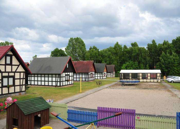 Dla naszych szanownych Gości oddajemy do dyspozycji kompleks 10 malowniczych dwurodzinnych domków letniskowych typu \\\"Mur Pruski\\\". Domki są w kolorach soczystej zieleni i stonowanej bieli, dzięki czemu malowniczo wpisują się w pobliski sosnowy las. Każdy z nich podzielony jest na dwie jednakowe części mieszkalne tak, by mogły w nim mieszkać 2 rodziny (4-5 osobowe). Wszystkie domki charakteryzują się wysokim standardem wykończenia, zarówno pokoju dziennego jak i aneksu kuchennego, sypialni i łazienki z prysznicem. Pokój dzienny to jasne czyste wnętrze, z dwuosobową kanapą, dostosowaną do spania, stołem jadalnym z krzesłami, szafą i telewizorem. Aneks kuchenny pozwoli na szybkie i sprawne przygotowanie posiłków dla całej wypoczywającej rodziny, a skoro o wypoczynku mowa to najlepiej oddać się słodkiemu lenistwu w dwuosobowej sypialni na piętrze. Ze swojej strony gwarantujemy dodatkowe atrakcje, które skutecznie przyciągną uwagę i zajmą zarówno dorosłych jak i małych wczasowiczów. Tych ostatnich serdecznie zapraszamy do spożytkowania nagromadzonej energii na naszym placu zabaw, trampolinie, boiskach do gry w piłkę nożną i siatkę plażową lub przy stole do tenisa, a także na zabawach tanecznych z konkursami dla dzieci. Opiekuni i rodzice mają do swojej dyspozycji grill, ognisko, wędzarnię i wyżej wspominaną karczmę, w której można zrelaksować się po dniu pełnym wrażeń, na przykład wybranym przez siebie napojem lub uczestnicząc w wieczorku tanecznym. Wychodząc naprzeciw oczywistym potrzebom naszych szanownych Gości - wypożyczamy akcesoria takie jak leżaki, parawany a także grile.