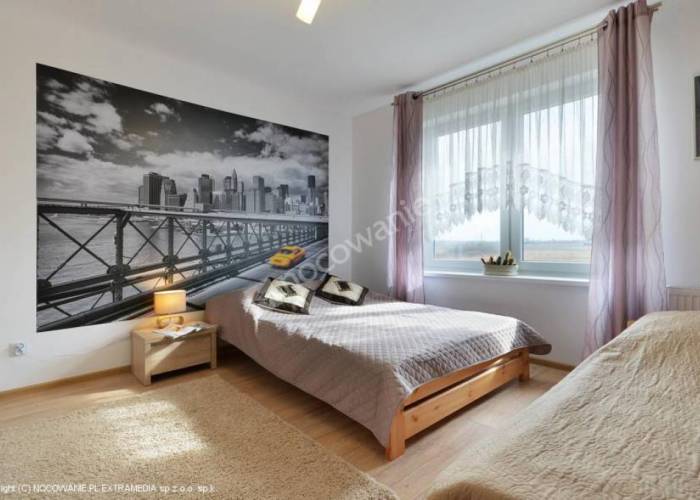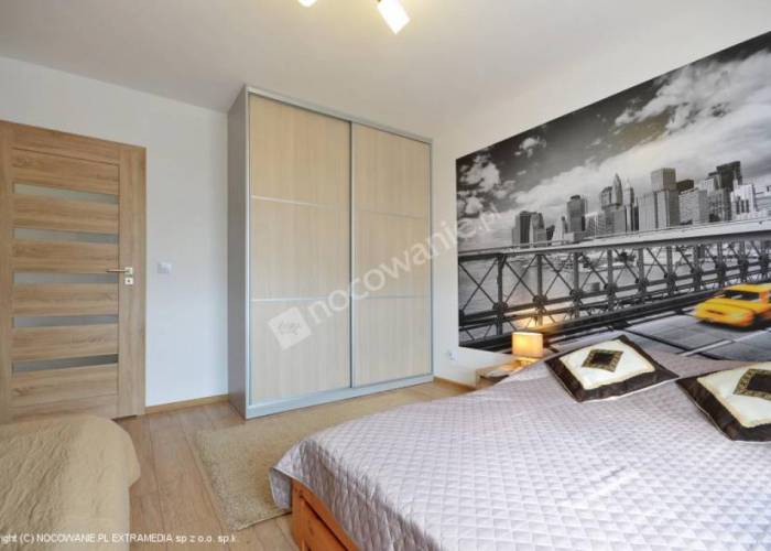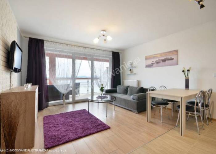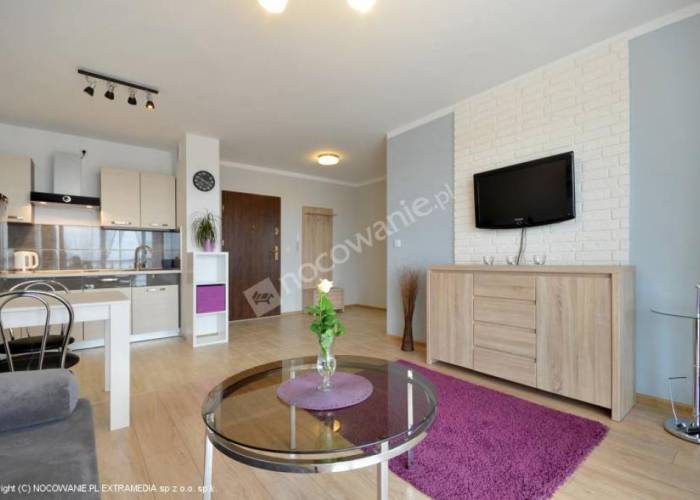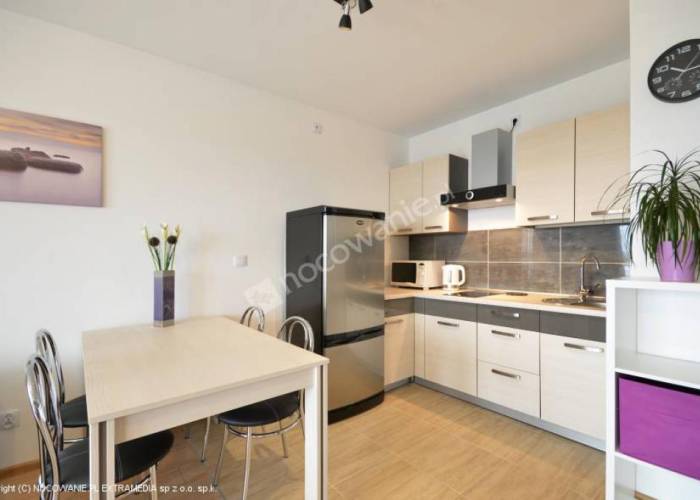 W części wypoczynkowej salonu znajdą się: elegancka sofa z funkcją spania dla 2 osób, ława, komoda oraz telewizor LCD. W aneksie kuchennym jest m.in. płyta indykcyjna, mikrofala, lodówka z zamrażarką, zlewozmywak, komplet sztućców i szklanek, czajnik bezprzewodowy, talerze, garnki i patelnia, stół z krzesłami. Sypialnia wyposażona jest w podwójne łoże małżeńskie i pojedyncze łóżko, szafkę nocną, lampkę oraz zabudowaną szafę. Łazienka wyposażona jest w kabinę prysznicową, umywalkę, toaletę i suszarkę do włosów. Otrzymują Państwo również komplet świeżych ręczników. Do dyspozycji parawan plażowy, leżaki, koc, suszarka balkonowa, żelazko i deska do prasowania. Bezpłatne miejsce parkingowe na terenie apartamentowca.