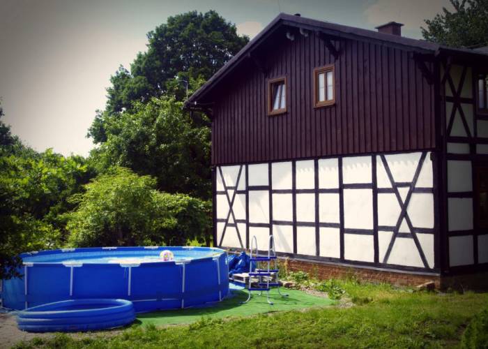 W cieniu brzozy rosnącej przed domem znajduje się basen ogrodowy dla dorosłych oraz mniejszy basenik dla dzieci.